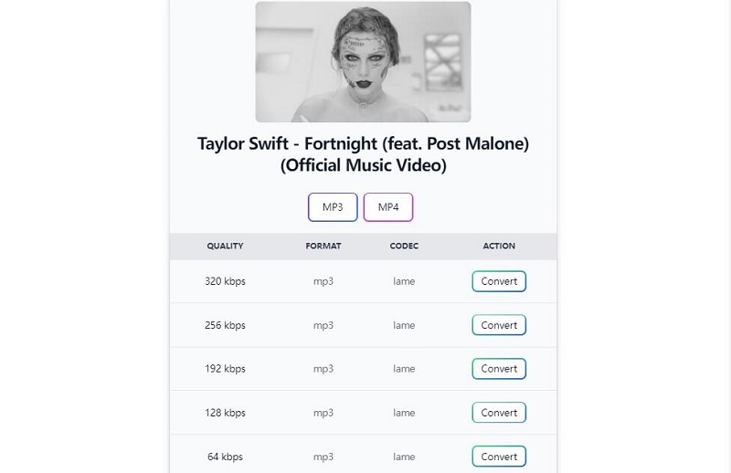 Step 4. On the download page, you will see different format options. Select the MP3 format, and hit the "Convert" button for the preferred bitrate to download the audio file.